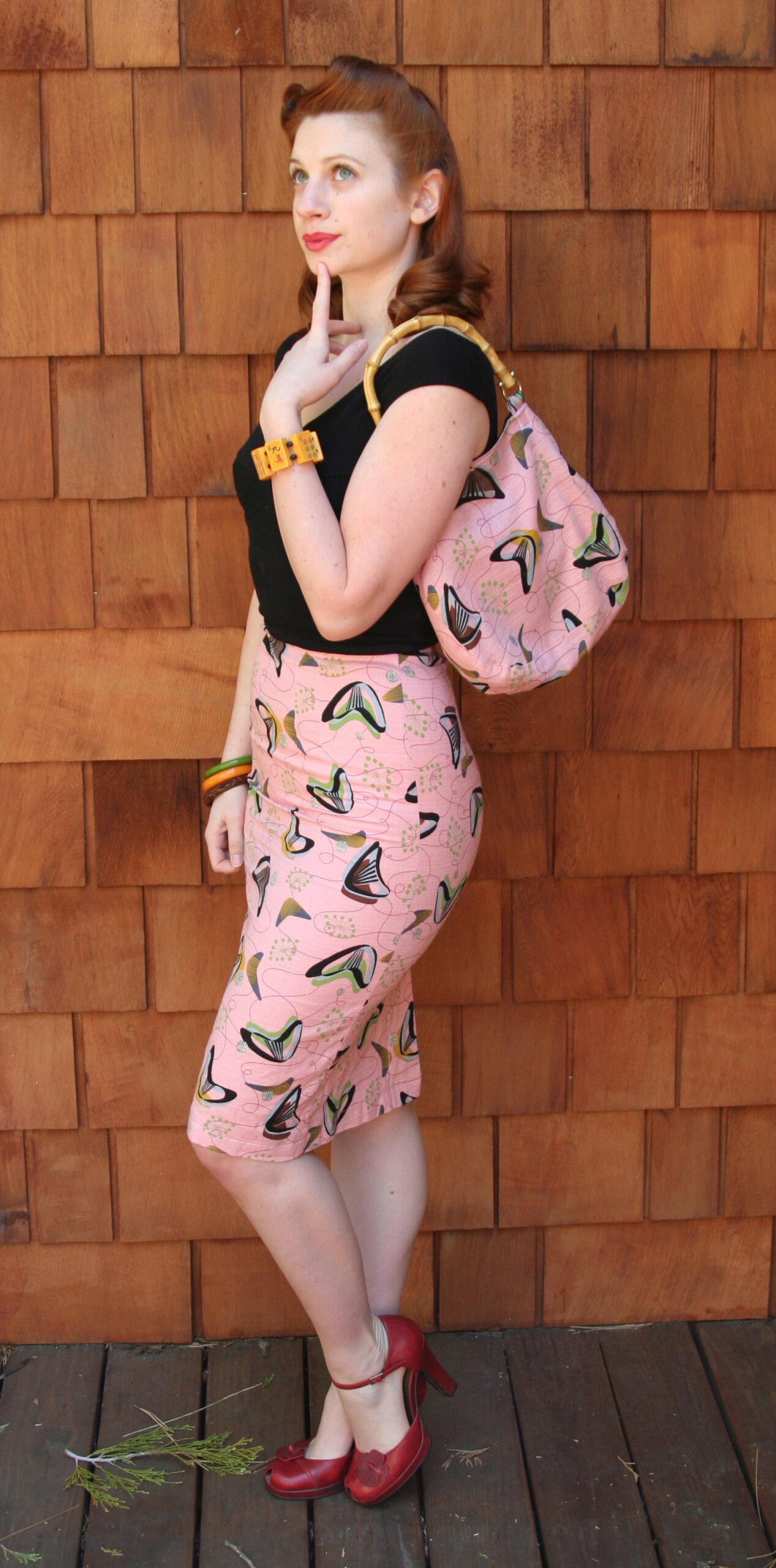 This will be your new favorite pencil skirt, made of 100% cotton barkcloth with a bold atomic boomerang print.